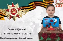 Главными атрибутами праздника Победы выступает Вечный Огонь, георгиевская ленточка, Голубь мира, красная звезда и гвоздики. Все эти элементы содержит работа Ваганова Ярослава из 1"Б" класса "Символ памяти - Вечный огонь".