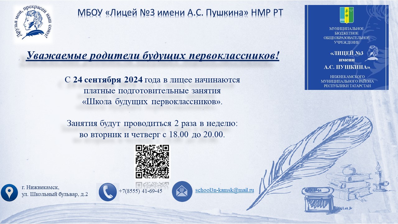 С 24 сентября 2024 года на базе МБОУ "Лицей №3 имени А.С. Пушкина" НМР РТ по адресу: ул. Школьный бульвар, д. 2, организуются платные подготовительные занятия "Школа будущих первоклассников".
