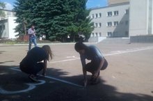 Наши ученики наносят разметку у Дома народного творчества для проведения торжественной линейки на выпускном вечере.
