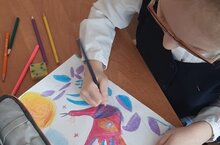 1 апреля - Международный День птиц. На уроке изобразительного искусства ребята учились рисовать сказочную птицу ладошкой. И сами ребята принесли атрибуты с изображением разных птиц.