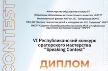 Поздравляем ученицу 9 "В" класса Баширову Адилю - Лауреата VI Республиканского конкурса ораторского мастерства "Speaking Contest" и ученицу 6 "В" класса Рахимову Зухру, занявшую 2-е место в данном конкурсе (руководитель Хикматуллина Л.З.). Молодцы!