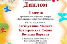 Поздравляем учениц 2 "В" класса: Бутлеровскую С., Волкову В., Загидуллину М. победителей Регионального творческого конкурса "Поэт страны детства: С. Михалков" (руководители Ушатикова Л.С., Сазонова Л.Ю.). Желаем всем дальнейших творческих успехов и побед!