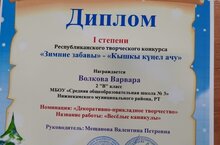 Поздравляем ученицу 2"В" класса Волкову Варю с Дипломом 1 степени в Республиканском творческом конкурсе "Зимние забавы" в номинации "Декоративно-прикладное творчество" (руководитель Мещанова В.П.). Молодец!