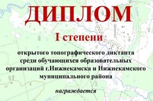 Дипломом I степени награждены учащиеся 4"А" класса Волков Андрей и Кириллова Ева (педагог Шугурова Л.Х.), учащиеся 9"Б" класса Игнатьев Данил и Александров Николай (педагог Бикмухаметова Н.И.) в открытом топографическом диктанте среди обучающихся образовательных организаций г. Нижнекамска и НМР. Молодцы, ребята!