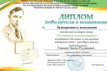 Дипломами победителей в номинации "За искренность исполнения" и "За самое вдохновенное исполнение" регионального конкурса чтецов "За строкой летит строка", посвященного 116-летию со дня рождения татарского поэта-героя Мусы Джалиля, награждены учащиеся нашей школы - Глюмов Эмиль и Сайфутдинов Динар (педагог Хоснуллина Р.Д.). Поздравляем! Молодцы!