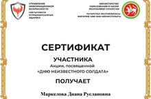 С 1 по 15 декабря прошла Акция, посвященная Дню Неизвестного Солдата, организованная Министерством образования и науки РТ. Цель данной Акции: сохранение исторической памяти и ознаменование 76-летия Победы в Великой Отечественной войне 1941-1945 годов, воспитание учащихся в духе патриотизма и уважения к своему Отечеству. В данном мероприятии, в номинации "Стихотворное произведение", приняли участие обучающиеся школы - Андронов Арсений, ученик 5"В" (руководитель Ельцова И.В.) и Маркелова Диана, ученица 9"Б" класса (руководитель Сазонова Л.Ю.). Всем участникам вручены сертификаты.