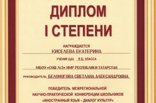 Поздравляем Киселеву Екатерину, ученицу 4"Б" класса, победителя межрегиональной научно-практической конференции школьников "Иностранный язык - диалог культур" (педагог Белоногова С.А.). Молодец! Желаем дальнейших успехов!
