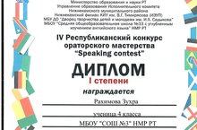 Поздравляем ученицу 4 "В" класса Рахимову Зухру, занявшую 1 место (педагог Хикматуллина Л.З.) и ученицу 11 "А" класса Хайруллину Алию, занявшую 2 место (педагог Белоногова С.А.) в IV Республиканском конкурсе ораторского мастерства "Speakinq contest". Так держать!