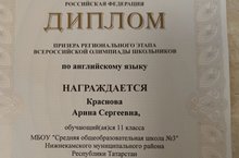 Поздравляем учителя английского языка Белоногову С.А. и ученицу 11 "Б" класса Краснову Арину - призера регионального этапа Всероссийской олимпиады школьников по английскому языку. Молодцы! Желаем Вам новых побед и достижений!