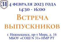 Встреча выпускников с учителями-предметниками и классными руководителями состоится 4 февраля 2023 года с 14:30 до 16:00 в нашей школе.