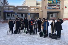 В составе трудового десанта ученики 5 «Д» класса. Под руководством учителя технологии Ашрапова З.К. сделали доброе дело: вышли на очистку территории школы от снега.