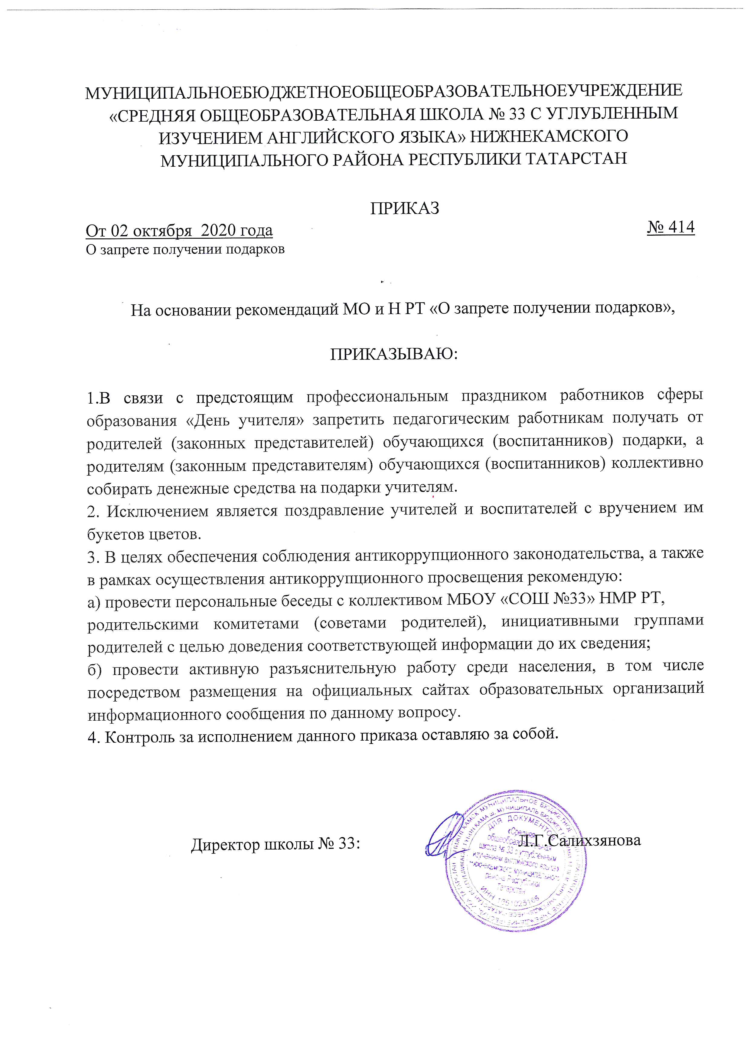 Приказ по МБОУ "СОШ №33" НМР РТ "О запрете получения подарков"