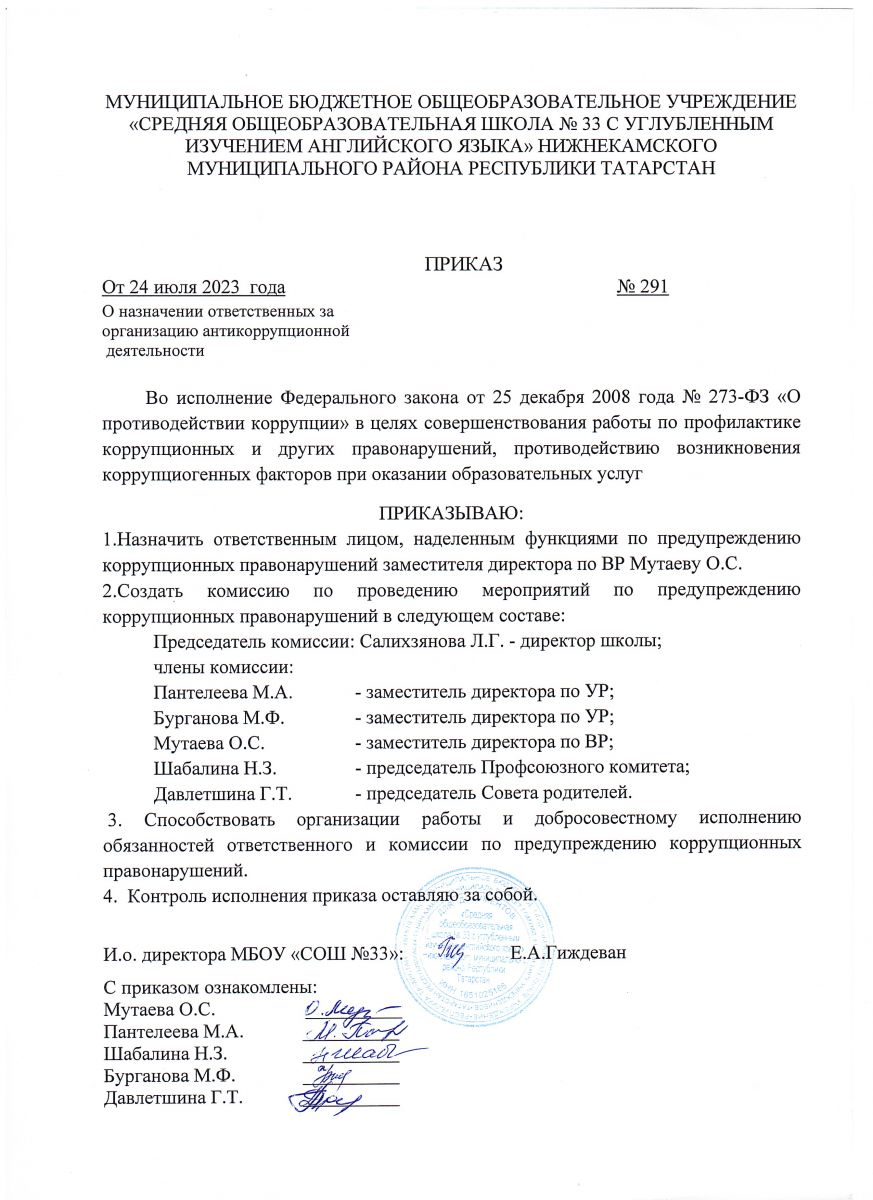 Приказ по МБОУ "СОШ №33" НМР РТ "О противодействии коррупции"