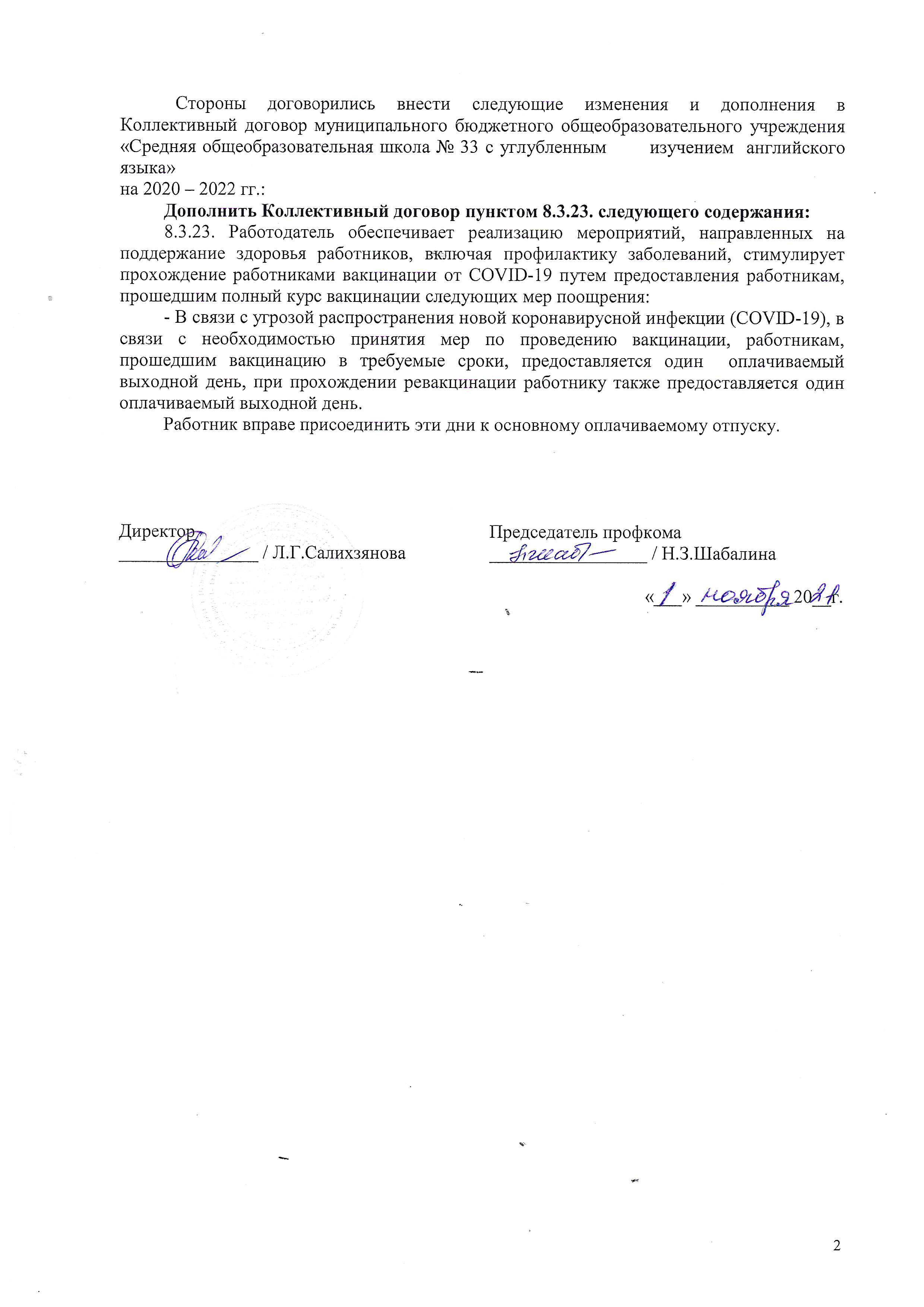 Коллективный договор МБОУ "СОШ №33" НМР РТ на 2020-2022 гг. Выписка из Соглашения о внесении изменений и дополнений в Коллективный договор Соглашение о внесении изменений и дополнений в Коллективный договор от 27.03.2025 г.