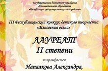 Поздравляем ученицу 7Б класса Напалкову Александру - лауреата II степени III Республиканского конкурса детского творчества "Мгновения осени".
