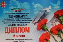 Поздравляем ученицу 7Б класса Дорофееву Полину, занявшую II место в Республиканском конкурсе творческих работ среди воспитанников, учащихся и и педагогических работников образовательных организаций "Салют Победы!" в номинации "Театральное творчество"(учитель Гимадеева Ляля Мунировна).