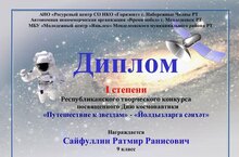 Поздравляем Сайфуллина Ратмира - победителя Республиканского творческого конкурса, посвящённого Дню космонавтики "Путешествие к звездам", в номинации "Изобразительное творчество". Также дипломом третьей степени награждена учитель английского языка Саттарова Алина Салаватовна в номинации "Творчество без границ".