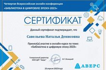 Библиотекарь нашей школы Савельева Наталья Денисовна приняла участие во Всероссийской онлайн-конференции и прошла онлайн-курс по теме "Библиотека в цифровую эпоху-2023".