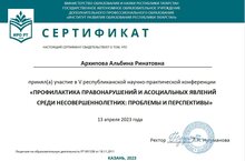 13 апреля педагог-психолог Архипова Альбина Ринатовна приняла участие в V республиканской научно-практической конференции «Профилактика правонарушений и асоциальных явлений среди несовершеннолетних: проблемы и перспективы».