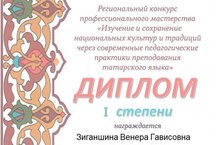 Поздравляем учителя родного языка Зиганшину Венеру Гависовну, занявшую первое место в Региональном конкурсе профессионального мастерства "Изучение и сохранение национальных культур и традиций через современные педагогические практики преподавания татарского языка" (ТИСКИ, г. Альметьевск).