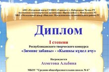 Поздравляем Ахметову Альбину, занявшую первое место в Республиканском творческом конкурсе "Зимние забавы" (учитель Хабирова Айгуль Миншакировна).