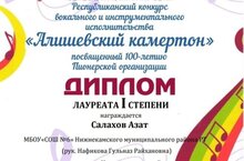Поздравляем Салахова Азата - лауреата первой степени Республиканского конкурса вокального и инструментального исполнительства "Алишевский камертон". Грамотой за высокий профессионализм награждена учитель музыки СОШ №6 Нафикова Гульназ Райхановна.