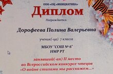 Поздравляем ученицу 7Б класса Дорофееву Полину, занявшую второе место во Всероссийском дистанционном конкурсе чтецов "О войне стихами мы расскажем" (учитель Гимадеева Ляля Мунировна).
