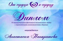 Поздравляем учениц 8В класса Панкратову Анастасию и Денисову Анастасию, награжденных дипломами VI Муниципального фестиваля талантливых людей с ограниченными возможностями здоровья "От сердца к сердцу" (руководитель Нафикова Гульназ Райхановна).