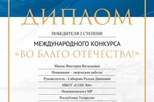 Поздравляем победителей Международных конкурсов "Во благо Отечества" - Минок Викторию и "Литературный мир" - Коновалову Меланию (учитель Сабирова Р.Д.).