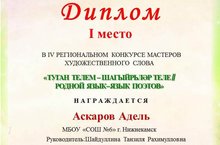 Поздравляем Аскарова Аделя, занявшего первое место, и Гилязеву Аделину, занявшую третье место в Региональном конкурсе мастеров художественного слова "Родной язык - язык поэтов" (учителя Шайдуллина Танзиля Рахимулловна, Сергеева Ирина Юрьевна).