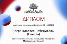 Поздравляем ученицу 3Б класса Хасанову Милану, занявшую I место во Всероссийской олимпиаде по математике "Новое древо" (учитель Сорокина Вера Александровна).