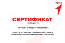 Советник по воспитанию Каюмова Екатерина Марселевна приняла участие в обучающем семинаре для наставников первичных отделений "Движения Первых" в Татарстане.