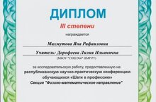 Поздравляем ученицу 11 класса Махмутову Яну, награждённую дипломом III степени за исследовательскую работу, предоставленную на Республиканскую научно-практическую конференцию обучающихся "Шаги в профессию". Благодарственное письмо за подготовку победителя получила учитель Дорофеева Лилия Ильинична.