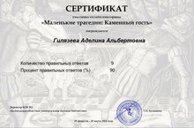 Обучающаяся 11А класса Гилязева Аделина приняла участие в онлайн-викторине "Маленькие трагедии: Каменный гость" (учитель Сергеева Ирина Юрьевна).