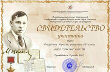 Учащийся 6В класса Файзуллин Марсель принял участие в Республиканском конкурсе видеороликов о творчестве и подвиге великого поэта Мусы Джалиля, посвященном 120-летию со дня его рождения (учитель русского языка и литературы Сергеева Ирина Юрьевна).