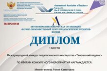 Диплом победителя I степени и благодарственное письмо Международного конкурса педагогического мастерства "Творческий педагог" получила учитель математики Миннегалиева Раиля Хамитовна.