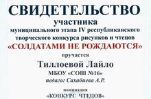 Активное участие в муниципальном этапе Республиканского творческого конкурса рисунков и чтецов "Солдатами не рождаются" стали Гилязева Аделина (учитель Сергеева Ирина Юрьевна) и Тиллоева Лайло (учитель Сахабиева Аниса Рафкатовна).