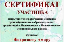 Сертификаты участников открытого топографического диктанта среди обучающихся образовательных организаций г. Нижнекамска и НМР РТ получили Фахразиев Амир, Шарипов Рустам (педагог Деева Рамзия Ахметовна).