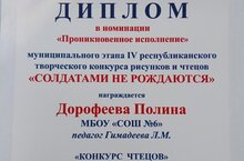 Поздравляем Дорофееву Полину, получившую диплом в номинации "Проникновенное исполнение" муниципального этапа Республиканского творческого конкурса рисунков и чтецов "Солдатами не рождаются" (учитель Гимадеева Ляля Мунировна).
