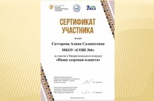Учитель английского языка школы 6 Саттарова Алина Салаватовна приняла участие в межрегиональном конкурсе "Наша здоровая планета" . Организатор конкурса "Фонд президентских инициатив", Ассамблея народов Татарстана, институт КНИТУ