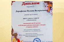 Поздравляем Дорофееву Полину, занявшую второе место в третьем Всероссийском конкурсе чтецов "Строки о войне". Благодарственным письмом награждена Гимадеева Ляля Мунировна