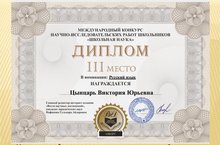 Поздравляем Цынцарь Викторию, обучающуюся 8"б" класса, занявшую третье место в международном конкурсе научно - исследовательских работ школьников "Школьная наука"( учитель Сергеева Ирина Юрьевна)