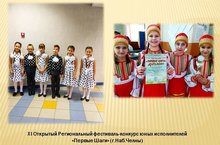 Ансамбль "Росинка"(обучающиеся 2”А” класса) приняли участие в XI Открытом Региональном фестивале-конкурсе юных исполнителей «Первые Шаги» (г.Наб.Челны). Дети посещают занятия по вокалу в ДТД и М им И.Х.Садыкова ( руководитель Ребракова А.З., концертмейстер Клипова А.Б). Хореографический ансамбль "Шома бас" стал лауреатом второй степени.