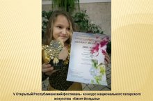 В г. Набережные Челны прошел V Открытый Республиканский фестиваль - конкурс национального татарского искусства «Бәхет йолдызы». Целью конкурса являлся активизация и формирование творческого потенциала подрастающего поколения, выявление наиболее одаренных исполнителей в области национального татарского искусства. Обучающаяся 5 “А” класса Басырова Самира (педагог Нафикова Г.Р.) стала дипломантом II степени приняла Открытого Республиканского фестиваля национального татарского искусства “Бәхет йолдызы”.
