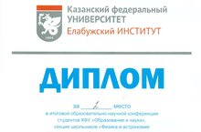 Ахияртдинова Зайнап - Дипломом за 3 место в итоговой образовательно-научной конференции КФУ «Образование и наука», секция школьников «Физика и астрономия в современном информационном пространстве». К научной конференции готовила Зайнап Дорофеева Л.И. Тесное сотрудничество учителя и обучающегося дает прекрасный результат. Вы-молодцы! Так держать!