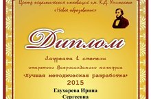 Поздравляем Глухареву Ирину Сергеевну, заместителя директора по воспитательной работе, учителя изобразительного искусства с победой во Всероссийском конкурсе "Лучшая методическая разработка 2015" Центра педагогический инноваций им К.Д.Ушинского "Новое образование".(г.Тюмень 2015")