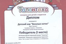 Поздравляем детских хор "Веселые нотки" (педагог Грачева С.Н.), занявший I место в XXII Всероссийском творческом конкурсе "Талантоха" в номинации "Вокальное и музыкальное искусство"