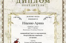 Позравляем Ищенко Арину (2А класс, педагог Грачева С.Н.), занявшую I место во Всероссийской олимпиаде по музыке Центра дистанционных мероприятий "Мир таланта".