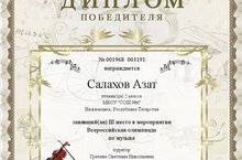 Позравляем Салахова Азата (2А класс, педагог Грачева С.Н.), занявшего III место во Всероссийской олимпиаде по музыке Центра дистанционных мероприятияй "Мир таланта".