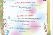 Поздравляем Сайфутдинову Мадину, занявшую III место в Международной дистанционной олимпиаде по музыке "Музыкальный ринг" для 1 - 4 классов Всероссийского образовательного портала "Продленка" (педагог Грачева С.Н.)